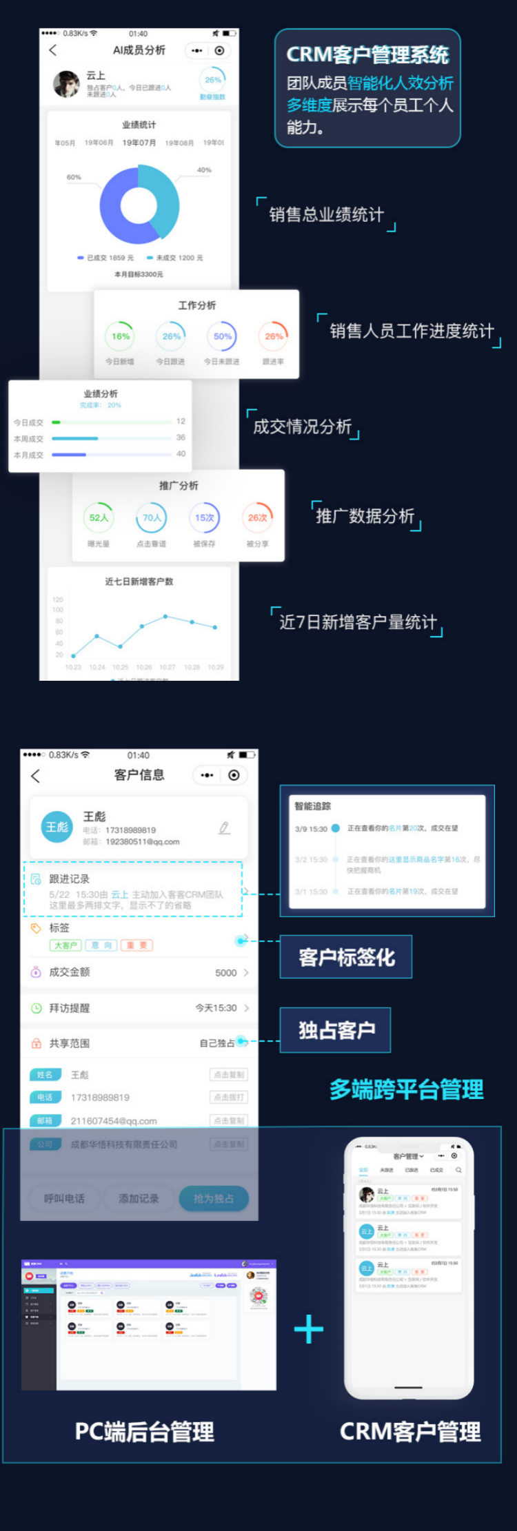 智能名片小程序主要由智能名片、产品秀、企业官网几部分组成。通过智能名片,可以一次传递个人信息、产品信息、企业官网等。 微信小程序,连接微信生态圈内10亿微信用户,小程序具有SCRM管理系统、商机雷达、在线IM沟通、企业品牌展示、微信社交分享等功能;人工智能分析用户行为,生成用户画像,辅助企业智能获客,快速成交;Boss天眼可以帮助企业管理者,管控销售资源,分析商机转化趋势,方便客户资源转接。